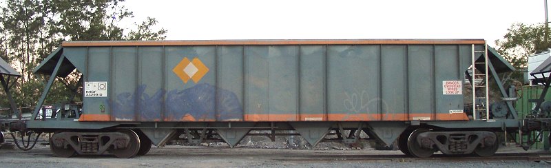 62 Wagons were given a new lease of life after being sold to the National Rail Corporation and recoded to RHAF/RHBF. They were purchased to service the Dunmore (NSW South Coast) to Enfield/Cooks River stone/aggregate contract which NR had been awarded. The wagons were chosen for this traffic as they were available for service relatively quickly and their lower gross mass allowed them to be used within the Sydney metropolitan area corridor (quarried aggregates for construction are much more dense than black coal, so a fully loaded RHGF required less train-length than partially loaded 100t hoppers). The VO wagons were recoded to RHAF/RHBF but retained their original numbers and converted to Standard gauge in Acacia Ridge before being transported south on National Rail steel trains. They were overhauled and repainted in National Rail’s orange and grey livery.